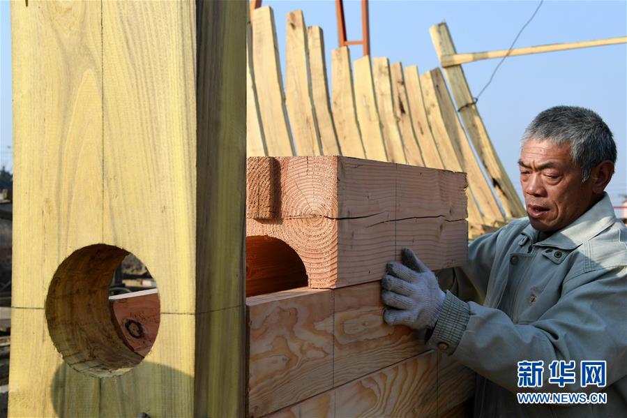 在青島紅雙木造船廠,一位造船師傅在加工構件(1月10日攝)。新華社記者 李紫恒 攝