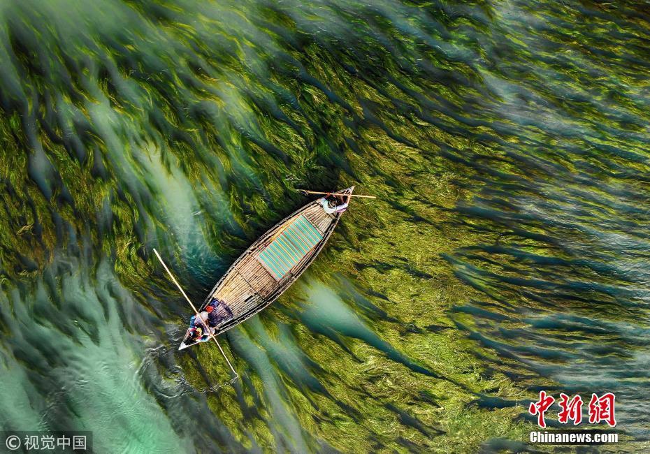 中國新聞網1月14日訊(具體拍攝時間不詳),孟加拉國烏拉帕拉,漁船在水流和藻類的映襯下前行,畫面看起來就像水彩畫一般。圖片來源:視覺中國