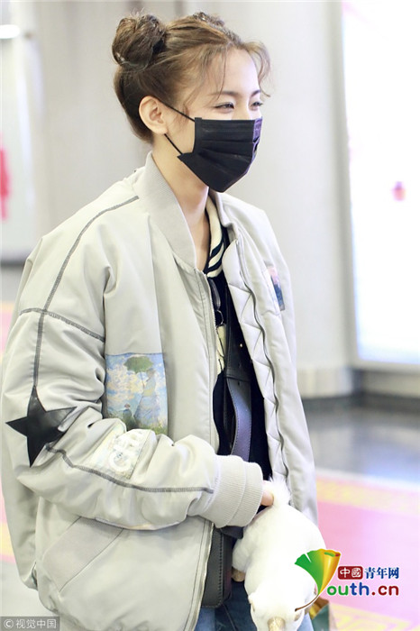 2019年1月14日,北京,楊超越現身機場。她扎哪吒頭活力十足,甩玩偶淘氣回眸,穿破洞褲露美腿,披面包服似自帶鼓風機。