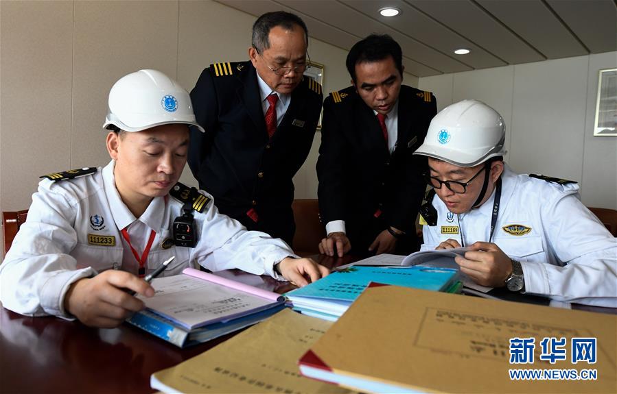 1月15日,海口海事局工作人員在粵海鐵4號(hào)客滾船上檢查文書文件。 新華社記者 楊冠宇 攝