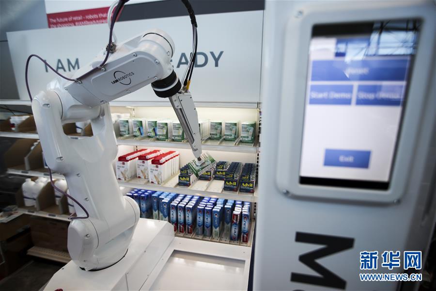 1月14日,在美國紐約舉行的全國零售商聯合會年度大會的“創新實驗室”展廳,自動取貨機器人根據顧客的要求抓取商品。 美國全國零售商聯合會年度大會于1月13日至15日在紐約舉行,許多來自世界各地的展商帶來使用新技術開發出的軟硬件產品,向觀眾展示未來零售業的新愿景。 新華社記者 王迎 攝