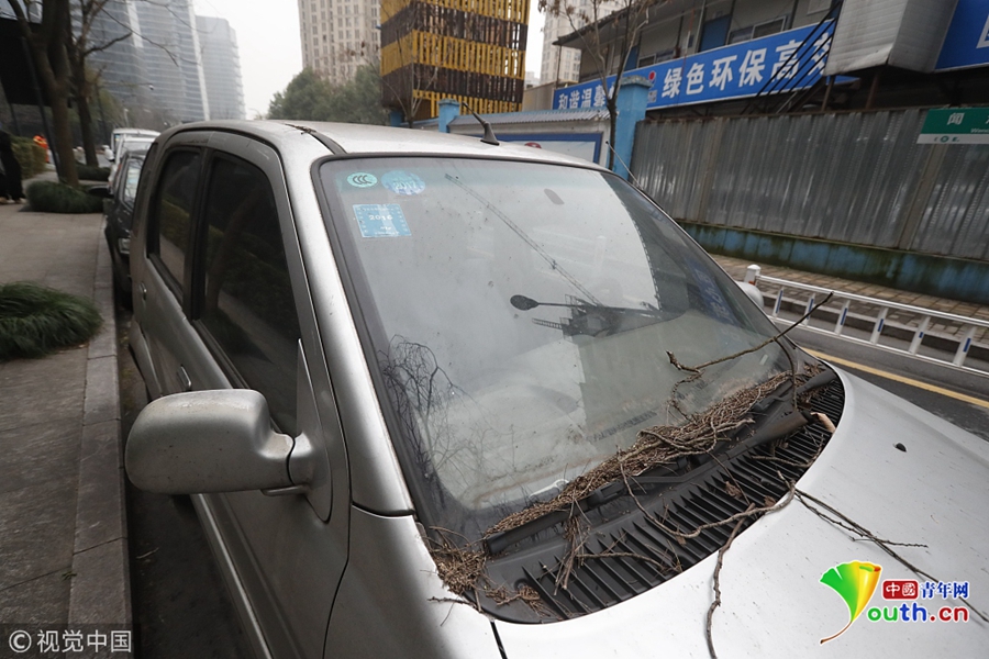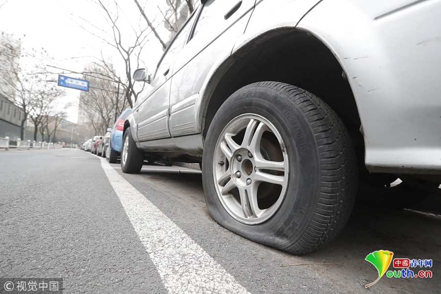 因為是免費停車位,就成為僵尸車的天堂。粗粗數了一遍,至少有10余輛汽車裹著車衣,被落葉等臟物覆蓋;有的車最后的年檢標志是3年前,車胎漏氣,車內也是堆著雜物。