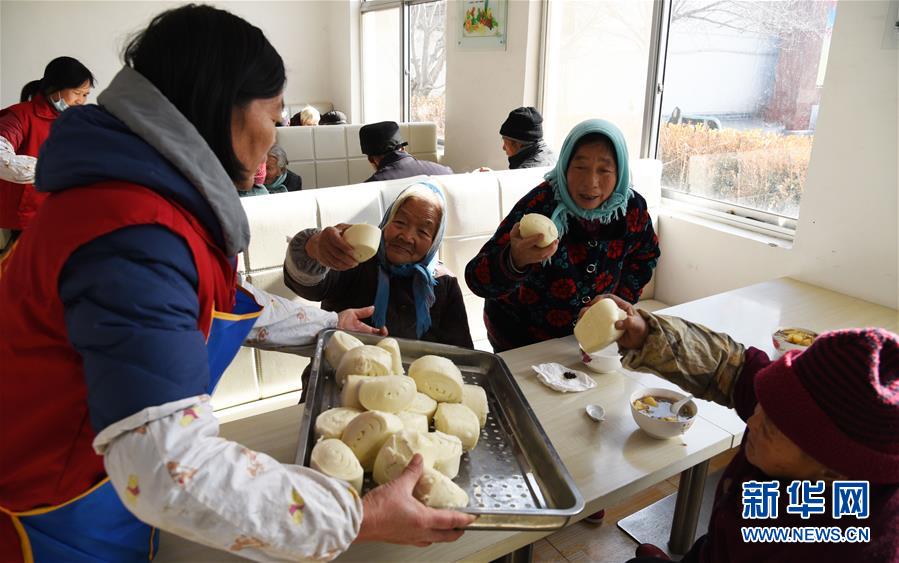 1月15日,村里的志愿者為就餐的老人分發饅頭。新華社記者王凱攝