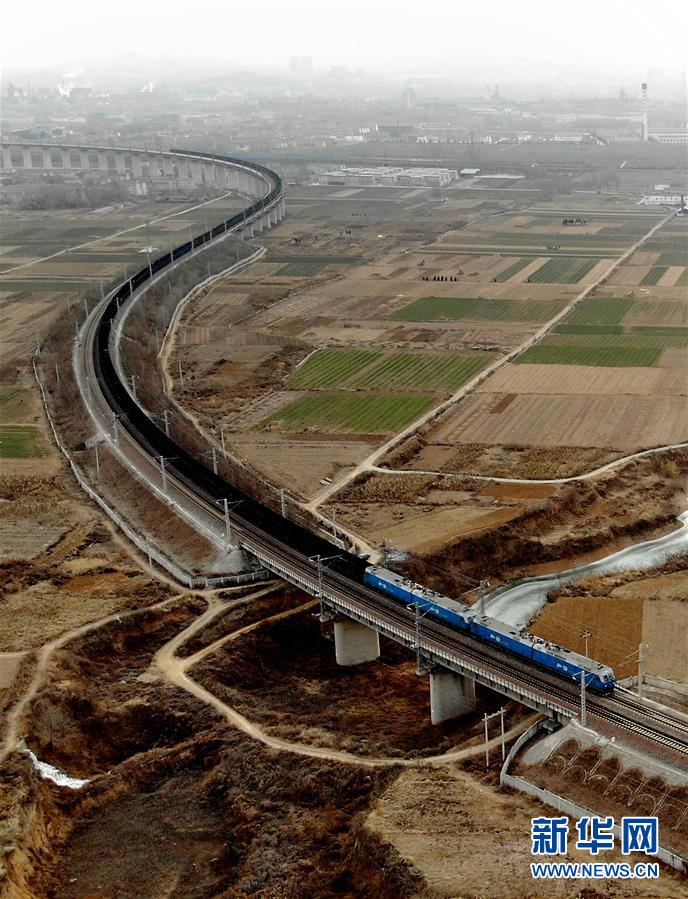 1月15日,一列重載列車行駛在瓦日鐵路紅旗渠至水冶南區段(無人機拍攝)。 新華社記者李安攝