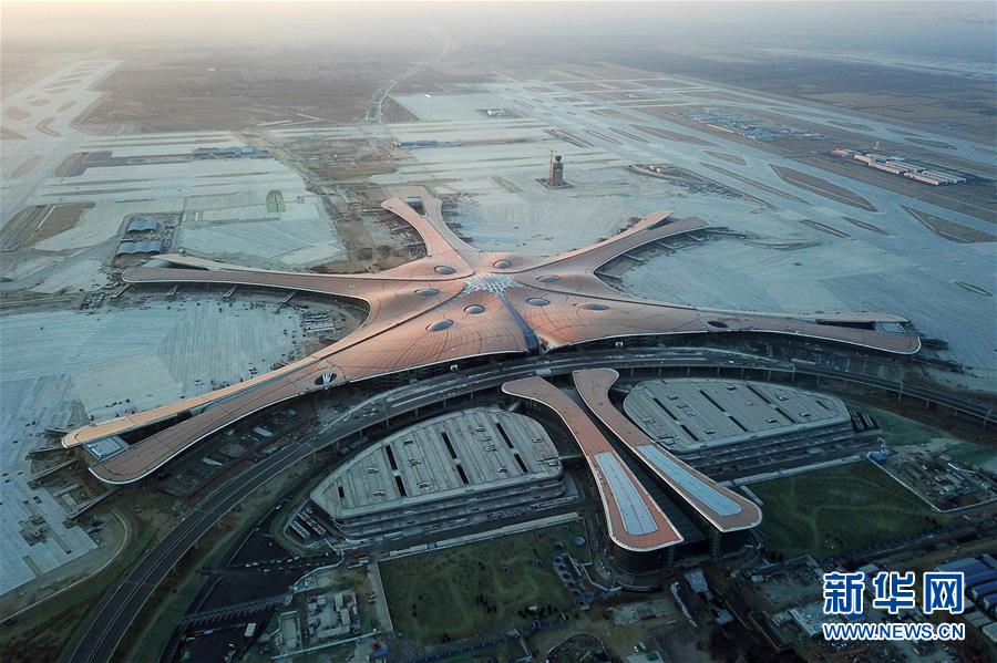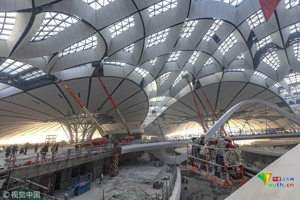 2018年12月19日,北京大興國際機場航站樓的屋面已基本完工,一只金色“鳳凰”完整地出現在北京城南。航站樓的室內裝修在有條不紊的推進中。