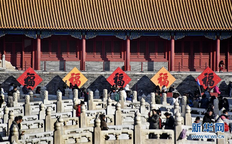 1月25日,游人在故宮內的“五福”前留影。 春節將至,北京故宮博物院內張燈結彩,到處懸掛著宮燈、萬壽燈、年畫、門神、福字等古代宮廷節日裝飾品,讓來自國內外的游人感受到濃濃的年味。 新華社記者 李欣攝