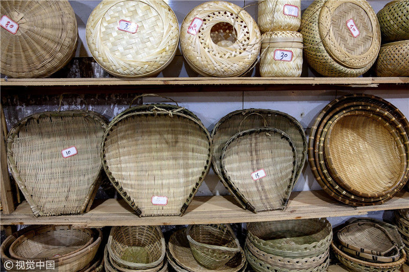 2019年1月26日,重慶中山古鎮,880桌“千米長宴”5萬人共品年味。古鎮居民們編制的竹編制品。