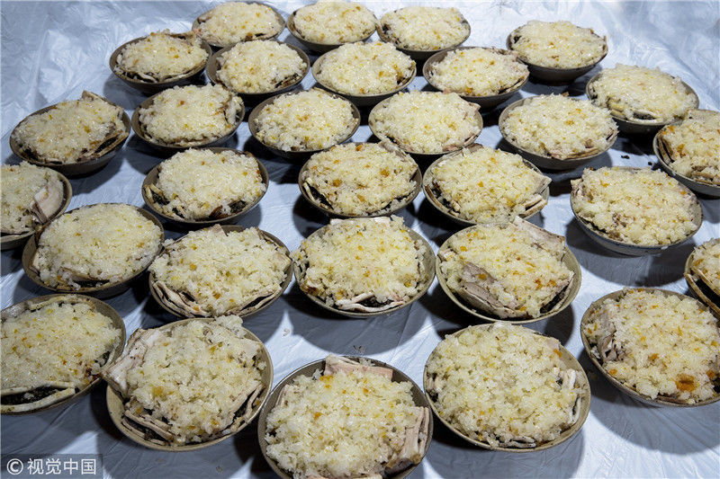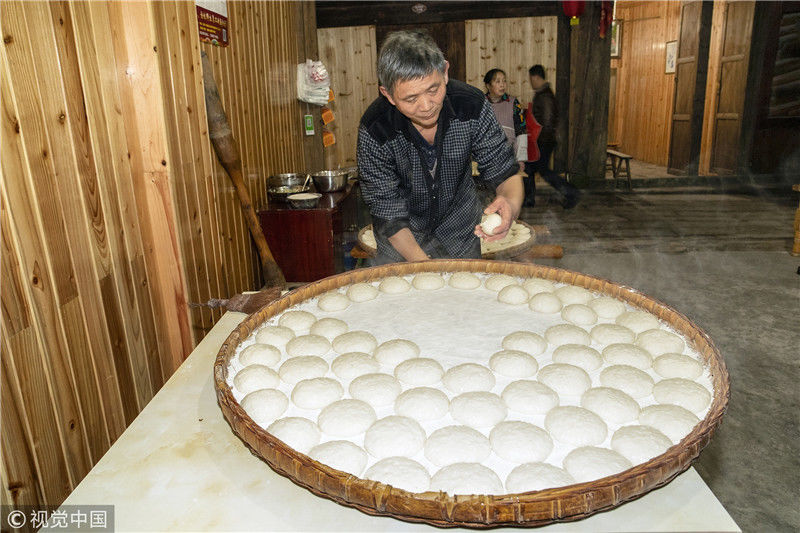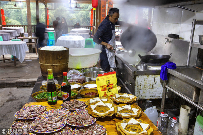 2019年1月26日,重慶中山古鎮,880桌“千米長宴”5萬人共品年味。街坊們在頭天就開始準備各種菜肴與小吃。