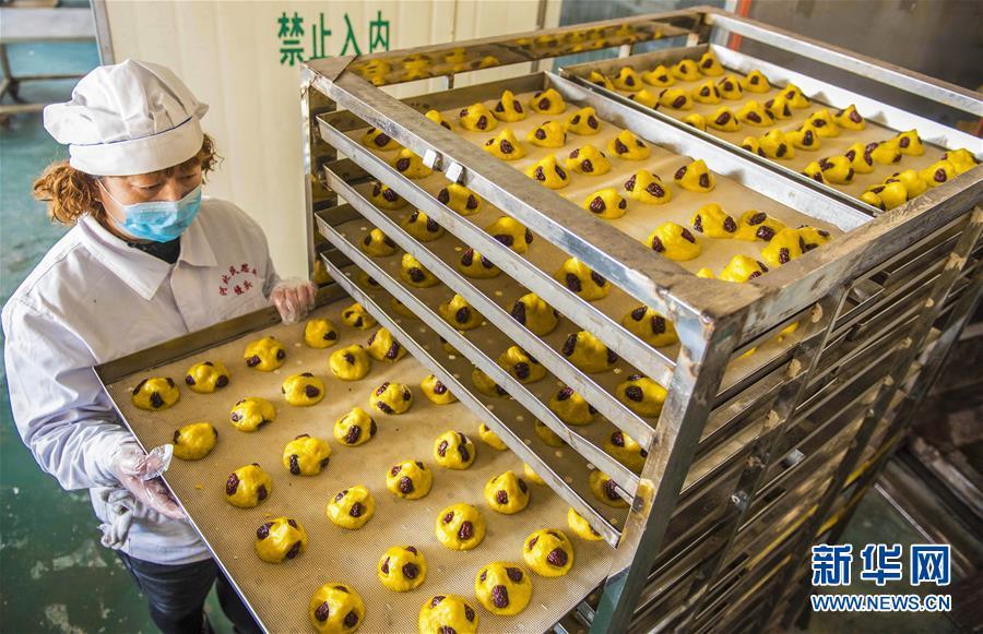 1月25日,在河北棗強一家食品公司,工人將新鮮花糕出爐。 春節臨近,河北省棗強縣面食加工廠的面點師傅們忙著趕制花糕、花饃等傳統面食,以供應節日市場。當地有過年蒸花糕、做花饃的習俗,寓意步步登高,生活一年比一年好。 新華社記者 李曉果攝