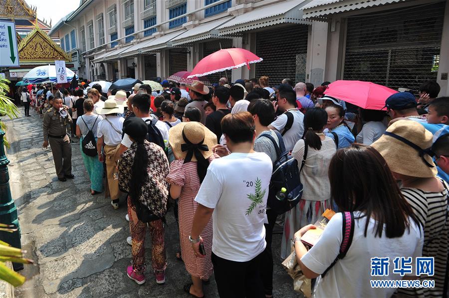 2月4日,在泰國曼谷的大皇宮外,中國游客排隊等待參觀。 雖然中國人過春節的傳統是返鄉回家,但越來越多的國人選擇在春節期間走出國門,利用春節假期外出旅游。 新華社發(拉亨 攝)