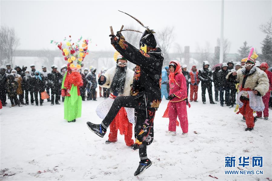 2月16日,社火隊演員在青海省大通回族土族自治縣文化廣場表演。新華社記者吳剛攝