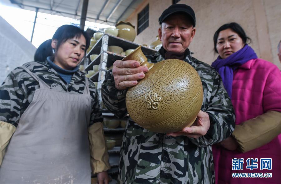 2月16日,陳新華(中)與徒弟們查看農歷新年第一窯燒制好的婺州窯天球瓶。新華社記者 徐昱 攝
