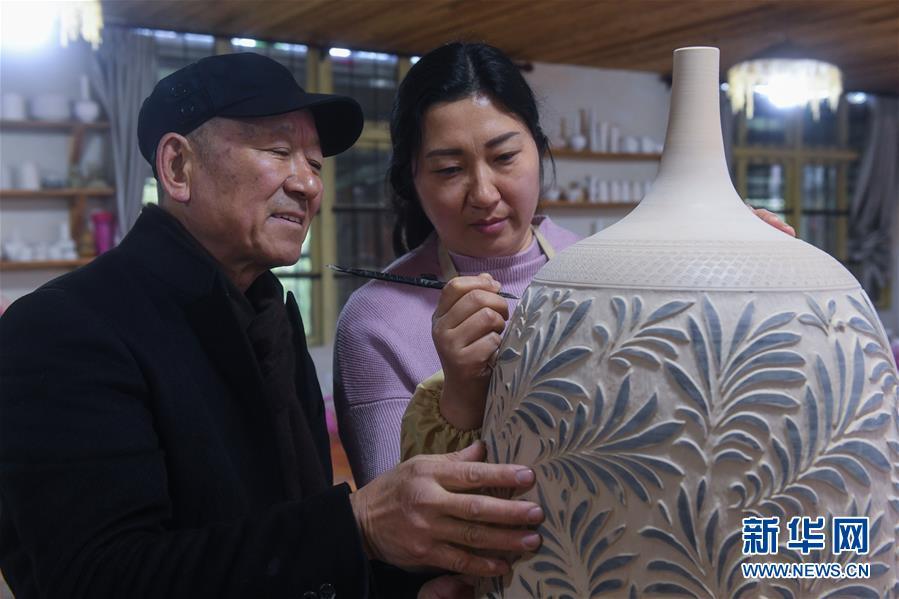 2月16日,陳新華(左)在指導徒弟進行刻花創作。新華社記者 徐昱 攝