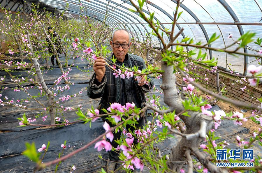 2月25日,果農在邯鄲市邯山區碩果春農業園大棚內為桃花授粉。 隨著氣溫升高,河北省邯鄲市邯山區碩果春農業園大棚內的桃花競相綻放。 新華社記者 王曉 攝