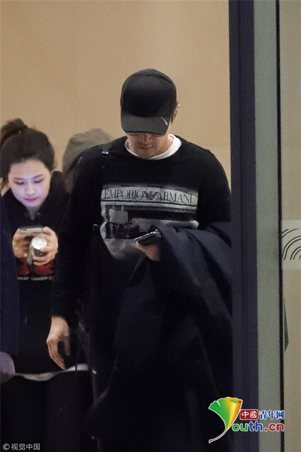 2019年2月25日,北京,胡歌現身機場。他身穿全黑套裝現身機場力求低調,一路低頭疾步前行,兩條長腿吸睛。