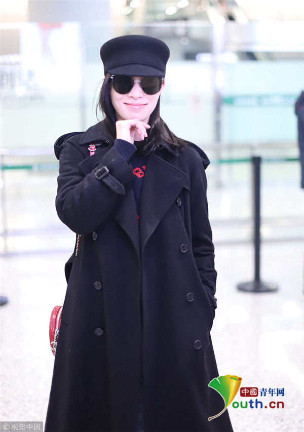 2019年2月28日,上海,佘詩曼現身機場。她頭戴禮帽,身穿黑色大衣走路帶風氣場強,單手托腮甜笑瞬間暖人心。