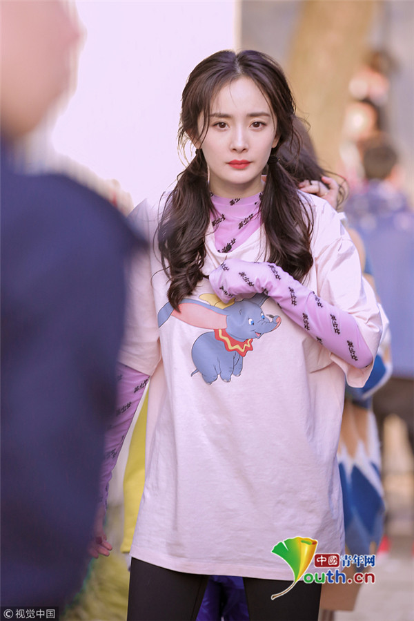 2019年3月12日,湖南長沙,楊冪錄制某綜藝節目路透曝光。她扎著雙馬尾甜美可愛似少女,穿oversized的牛仔外套和寬大T恤,戴著防曬的護袖,身材十分纖細苗條。錄制期間,楊冪氣質明艷靈動活潑,元氣滿滿青春感爆棚。