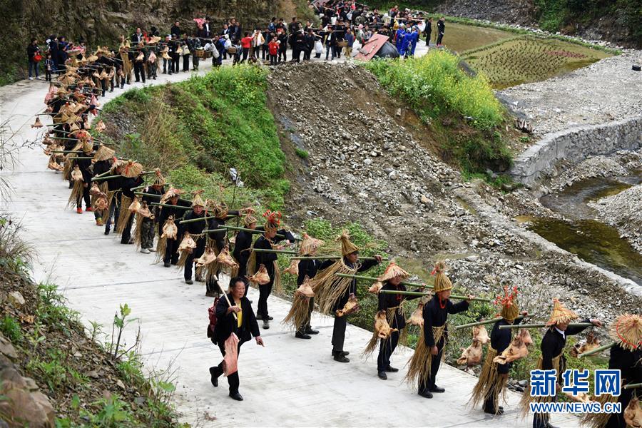 4月7日,苗族群眾挑著祭品走在祭“巫耶”儀式途中。4月6日至7日,在貴州省黔東南苗族侗族自治州劍河縣觀么鎮新民村和新合村,來自劍河縣和三穗縣的苗族同胞歡聚一堂,通過民族歌舞展演、非遺手工藝展示、千戶祭“巫耶”、跳蘆笙舞等形式,與來賓一起歡慶2019年高雍苗族“三月三”民俗文化節。 新華社記者 楊文斌 攝