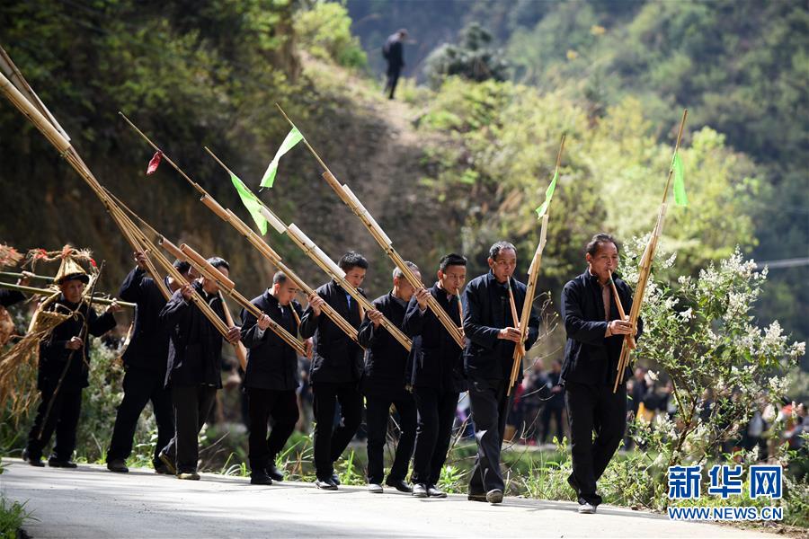 4月7日,苗族群眾吹著蘆笙走在參加“三月三”民俗活動途中。4月6日至7日,在貴州省黔東南苗族侗族自治州劍河縣觀么鎮新民村和新合村,來自劍河縣和三穗縣的苗族同胞歡聚一堂,通過民族歌舞展演、非遺手工藝展示、千戶祭“巫耶”、跳蘆笙舞等形式,與來賓一起歡慶2019年高雍苗族“三月三”民俗文化節。 新華社記者 楊文斌 攝