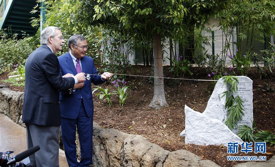 4月6日,在美國圣迭戈動物園,中國駐洛杉磯總領事張平(右)為“大熊貓保護項目”紀念碑揭幕。新華社記者李穎攝
