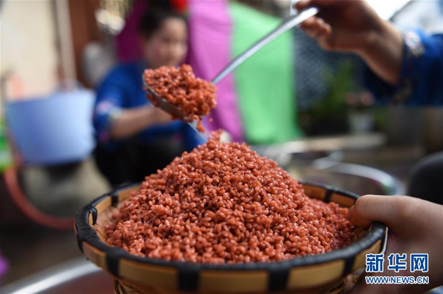 4月16日,在貴州省臺江縣姊妹街哆蝶五彩姊妹飯體驗店,苗家婦女在制作五彩“姊妹飯”。新華社發(劉開福 攝)