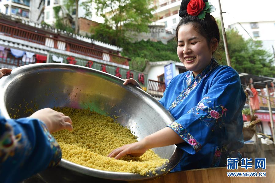 4月16日,在貴州省臺江縣姊妹街哆蝶五彩姊妹飯體驗店,苗家婦女在制作五彩“姊妹飯”。新華社發(劉開福 攝)