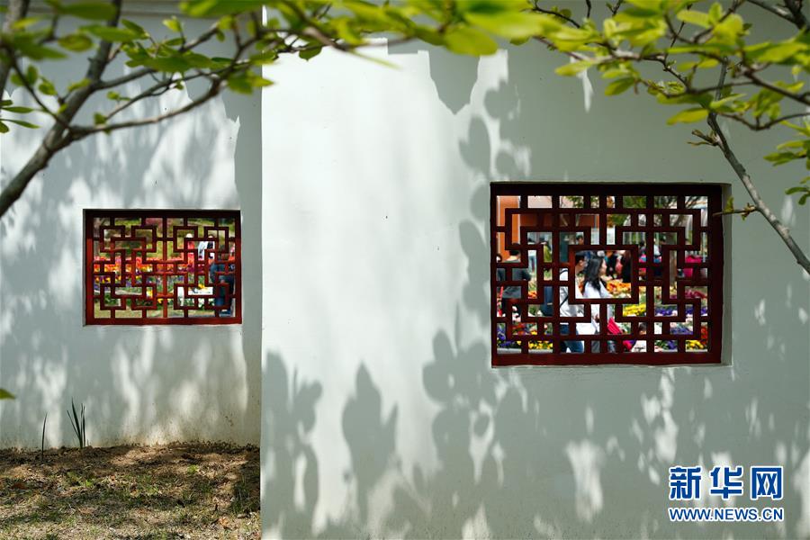 2017年4月28日,游客在美國紐約寄興園內(nèi)游覽。仿照中國蘇州園林設(shè)計建造的寄興園位于紐約斯塔滕島,占地面積約4000平方米,其所用的建筑材料大都在蘇州加工制造,并由40名來自蘇州的藝術(shù)家和工匠歷時6個月在紐約修建而成。 新華社記者王迎攝
