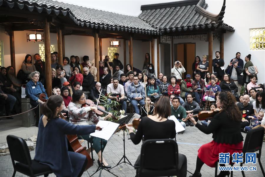 2018年2月24日,人們在美國紐約大都會博物館“明軒”欣賞演出,慶祝新春佳節。中式庭院“明軒”是中國第一個落戶海外的蘇式園林,位于美國紐約大都會博物館二層的玻璃天棚下,是模仿中國蘇州網師園中的“殿春簃”設計建造而成的。“明軒”由蘇州市園林管理局承建,所用的磚、瓦、木材、構件等在中國備好后,由20余名中國工程師和工匠在美國組裝。 新華社記者王迎攝