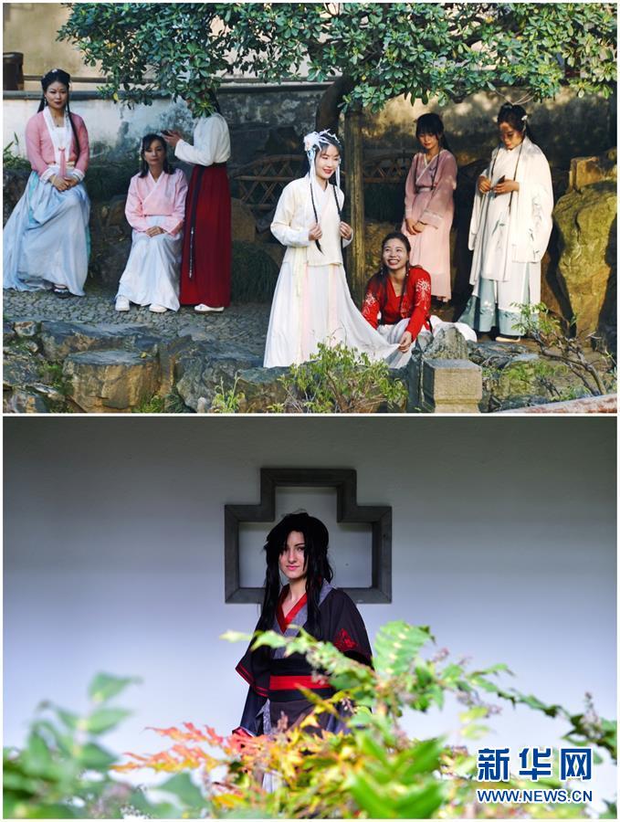 這張拼版照片展示的是:上圖,2019年4月1日,游客在中國蘇州耦園內身著古裝拍照(新華社記者杜涓涓攝);下圖,2019年4月13日,一名當地游客在德國曼海姆中式園林“多景園”內身著古裝拍照(新華社記者逯陽攝)。