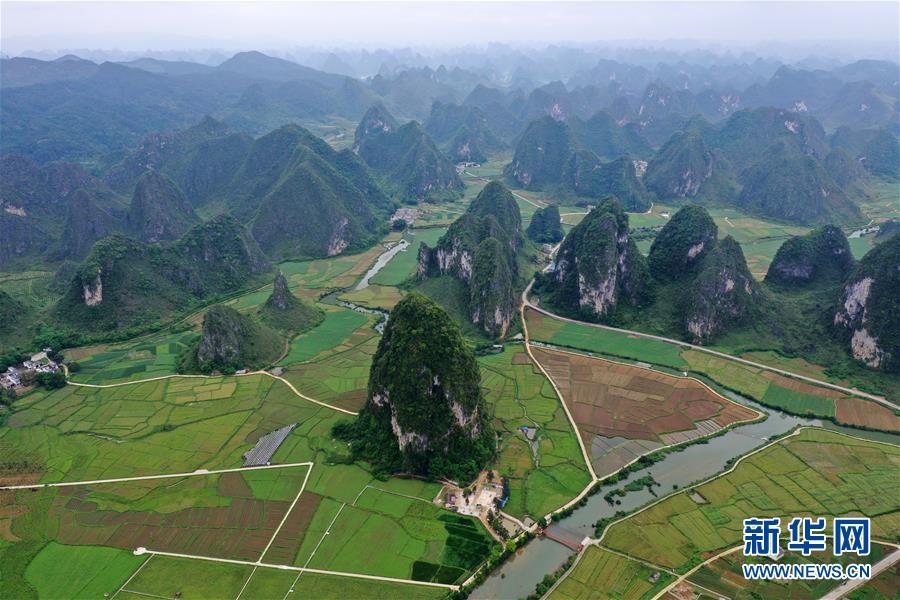 這是廣西靖西市新靖鎮(zhèn)境內(nèi)的田園風(fēng)光(4月16日無(wú)人機(jī)拍攝)。 新華社記者 陸波岸 攝