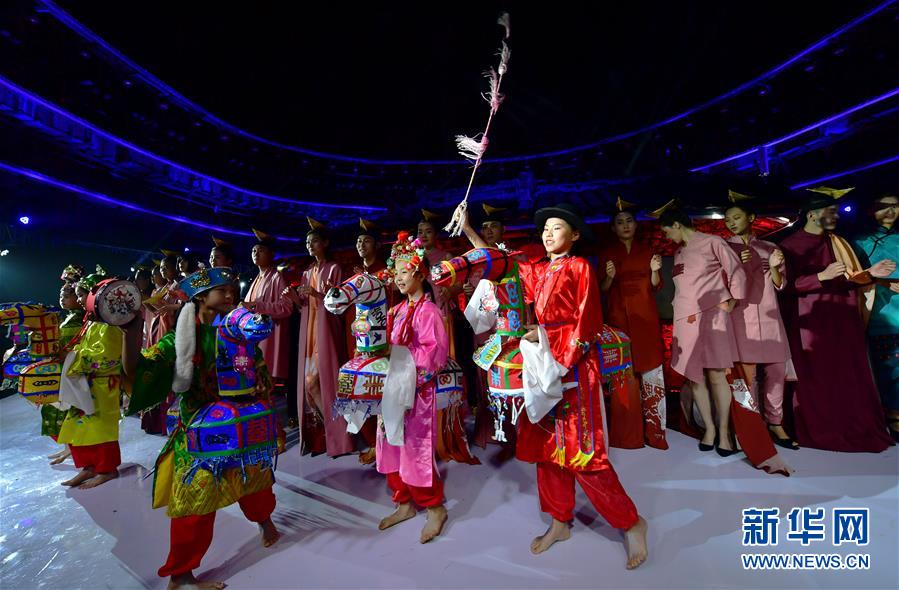 4月27日,表演結束后,模特在向觀眾致意。 當日,土樓光語國際時尚大秀在福建省南靖縣的土樓裕昌樓內舉行。這場融匯文化、時尚與旅游元素的大秀,通過傳統與時尚的有機融合,展現南靖土樓及文化的魅力和風采。 新華社記者魏培全攝