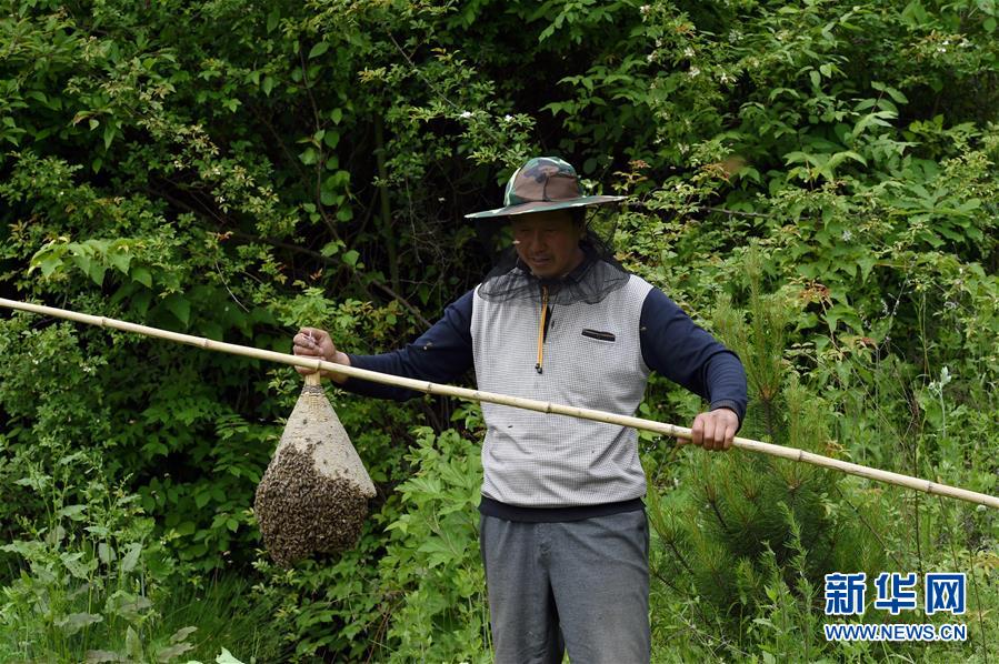 5月10日,在甘肅省隴南市徽縣大河店鎮(zhèn)硬灣村,蜂農(nóng)周仲頤在收蜂。 甘肅省隴南市徽縣大河店鎮(zhèn)硬灣村位于秦巴山區(qū)深處,2017年,在當(dāng)?shù)卣姆龀窒拢堁吕铣裁垧B(yǎng)殖農(nóng)民專業(yè)合作社成立,蜂農(nóng)們將傳統(tǒng)養(yǎng)蜂技藝和現(xiàn)代加工方式相結(jié)合,并通過電商等渠道打開銷路,有效帶動了當(dāng)?shù)刎毨Т迕衩撠氈赂弧D壳罢麄€合作社共有蜂箱2000余個,每箱每年可帶來三四千元的收入。 新華社記者 馬寧 攝