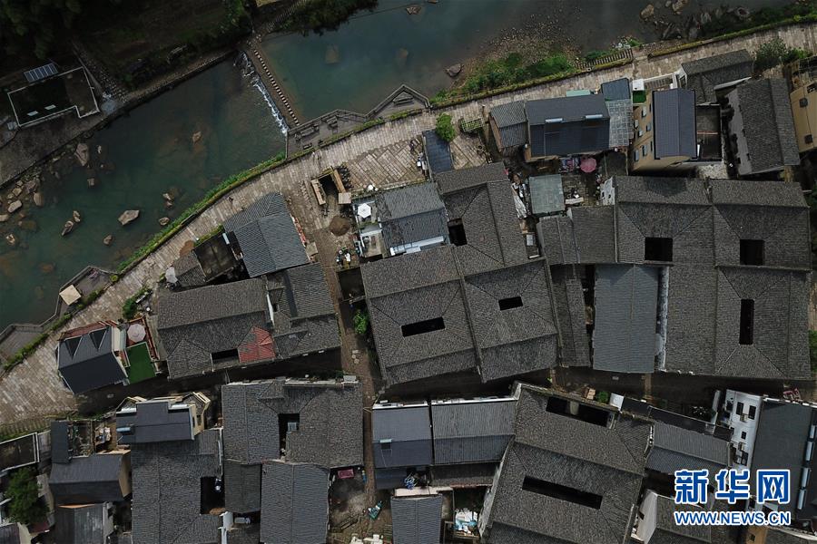 5月26日無人機拍攝的富春江鎮石舍村的古建筑群。 石舍村是浙江省桐廬縣富春江鄉村慢生活體驗區中的三個村落之一,位置偏僻,依溪而居,風景秀美。近年來,石舍村結合古建筑保護工作,在清潔、美化村莊的基礎上,對一些廢棄古建筑進行修繕,引入咖啡館、民宿等文化創意類項目,優良的生態環境和濃郁的文化氛圍吸引大批游客前來體驗,小山村走上了一條發展美麗經濟之路。2018年,石舍村接待游客10萬8千余人次,旅游經營凈收入1260余萬元。 新華社記者 黃宗治 攝