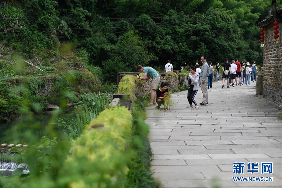 游客在石舍村游覽(5月25日攝)。 石舍村是浙江省桐廬縣富春江鄉村慢生活體驗區中的三個村落之一,位置偏僻,依溪而居,風景秀美。近年來,石舍村結合古建筑保護工作,在清潔、美化村莊的基礎上,對一些廢棄古建筑進行修繕,引入咖啡館、民宿等文化創意類項目,優良的生態環境和濃郁的文化氛圍吸引大批游客前來體驗,小山村走上了一條發展美麗經濟之路。2018年,石舍村接待游客10萬8千余人次,旅游經營凈收入1260余萬元。 新華社記者 黃宗治 攝