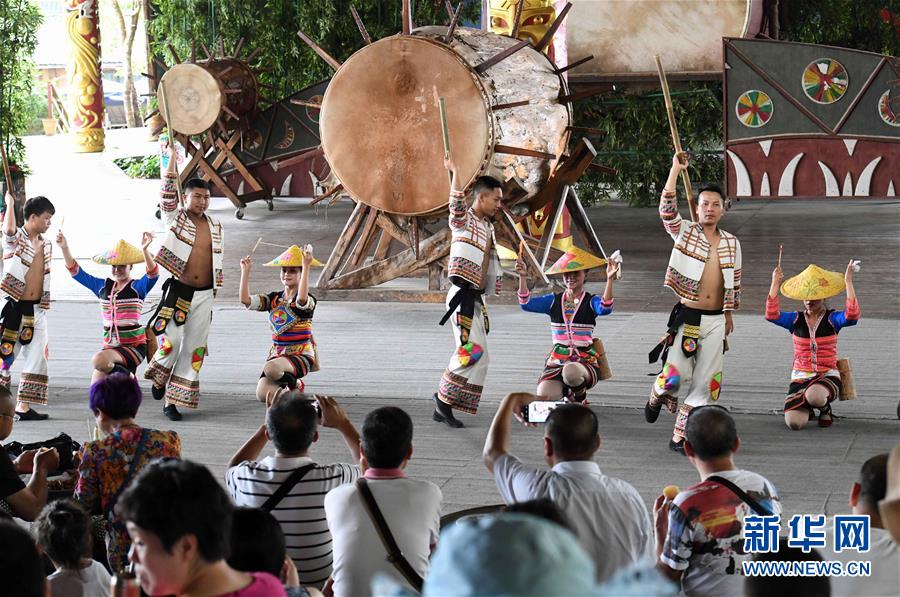基諾族演員在表演大鼓舞(6月1日攝)。 在云南省西雙版納傣族自治州景洪市基諾山基諾族鄉的基諾族村寨,每天的基諾大鼓舞表演吸引了眾多游客前來觀賞體驗,帶動了基諾族群眾就業和增收。基諾族大鼓舞蘊涵豐富的歷史文化內涵,已被列入國家級非物質文化遺產保護名錄。 新華社記者 楊宗友 攝