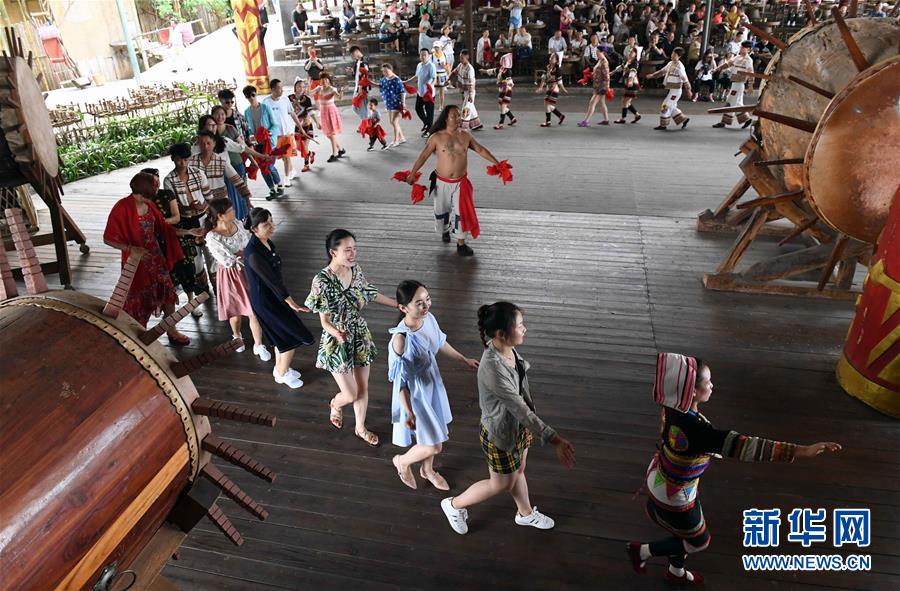 游客與基諾族大鼓舞演員一起跳舞(6月1日攝)。 在云南省西雙版納傣族自治州景洪市基諾山基諾族鄉的基諾族村寨,每天的基諾大鼓舞表演吸引了眾多游客前來觀賞體驗,帶動了基諾族群眾就業和增收。基諾族大鼓舞蘊涵豐富的歷史文化內涵,已被列入國家級非物質文化遺產保護名錄。 新華社記者 楊宗友 攝