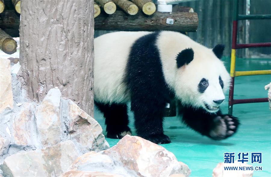 6月18日,大熊貓“和風”在裝修一新的大熊貓館內散步。 當日,來自四川的大熊貓兄弟“和風”與“星光”飛抵上海,正式開始了在上海動物園為期三年的生活。為迎接這對“風光兄弟”,上海動物園將原有的大熊貓館擴建并裝修一新,空調、水池、游樂場以及竹葉儲存間等配置齊全。 新華社記者 方喆 攝