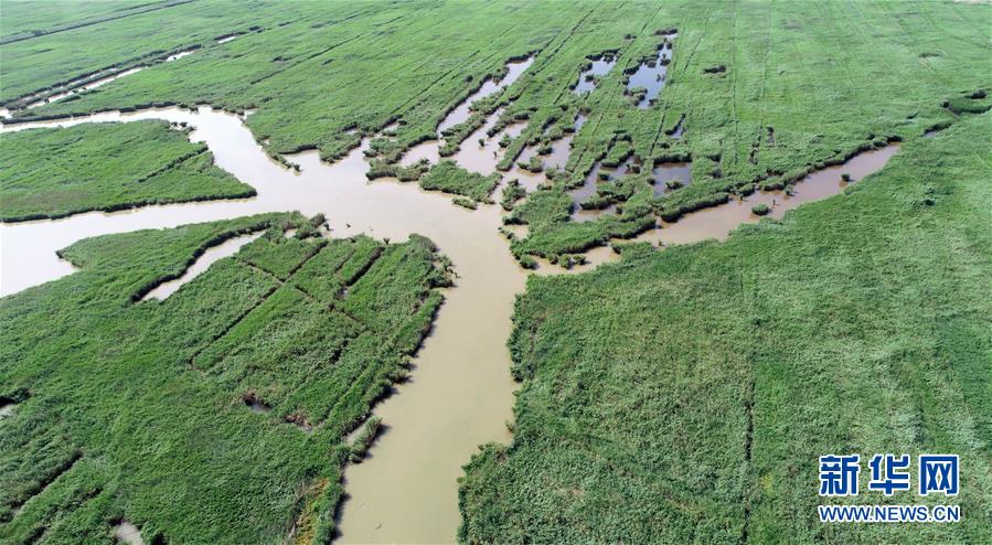這是天津市寧河區七里海濕地內蘆葦和水面形成的圖案(6月22日無人機拍攝)。新華社記者 岳月偉 攝