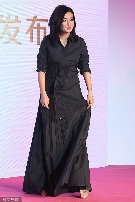 趙薇一身黑色長裙現身發布會現場,化著淡妝的她看起來氣色不錯。趙薇的臉頰圓潤,看起來比影視劇中胖了不少。
