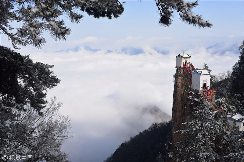 3月3日拍攝的塔云山金頂觀音殿。雪后初霽,秦嶺深處的塔云山景區云海翻騰,宛如仙境。位于陜西省鎮安縣柴坪鎮境內的塔云山,其主峰上的古建筑群始建于明正德年間,其中金頂觀音殿建于塔云山萬仞絕頂之上,遠遠望去,壯觀無比。 新華社記者陶明攝