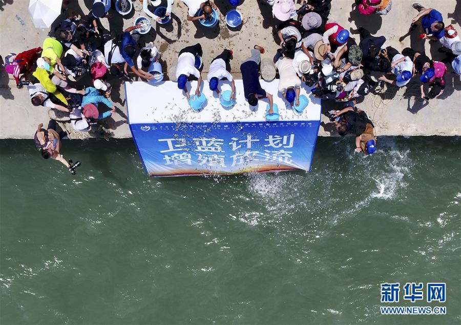 8月3日,首屆福清開漁節增殖放流活動上人們在向大海投放魚苗(無人機拍攝)。