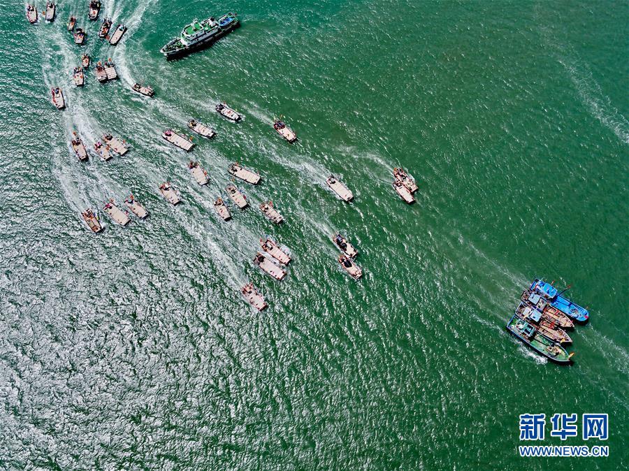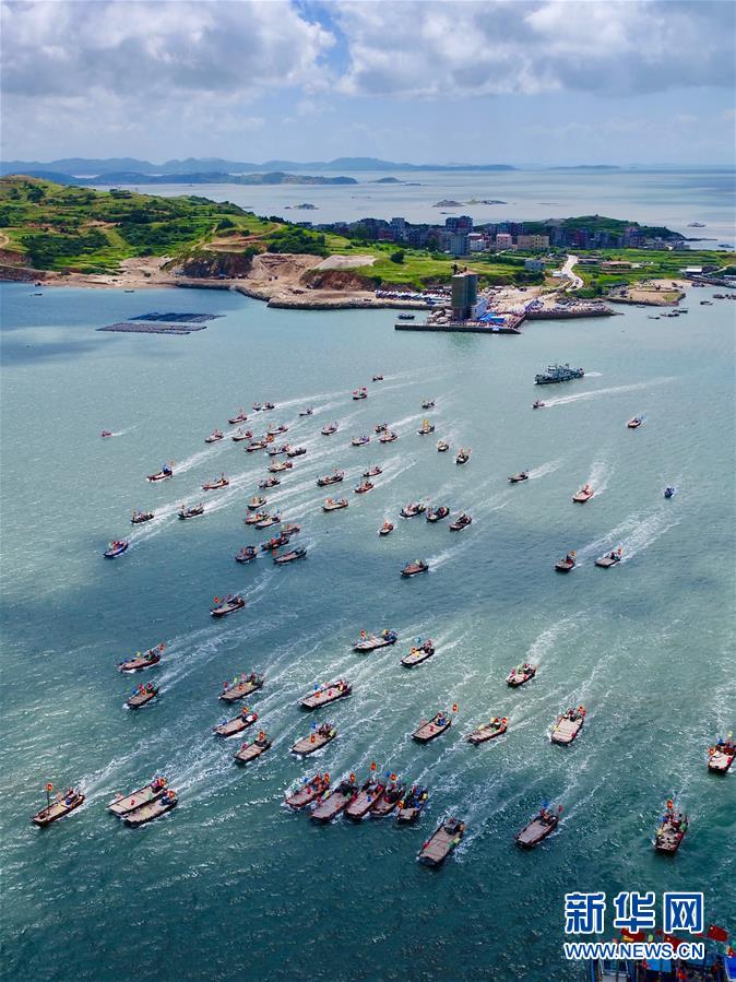 8月3日,在首屆福清開漁節上,漁船駛向大海(無人機拍攝)。新華社記者姜克紅攝