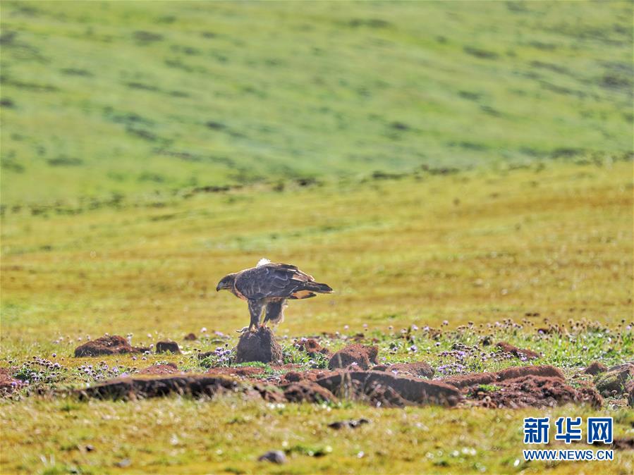 一只大鵟準備享用捕獲的獵物(8月14日攝)。 8月12日至14日,來自全國各地的31名自然愛好者聚集在海拔4200米的青海省玉樹藏族自治州稱多縣嘉塘草原,參加“2019嘉塘自然觀察節(jié)”。自然愛好者用獨特視角記錄珍稀野生動植物,觀察三江源生態(tài)。 新華社記者 張大川 攝