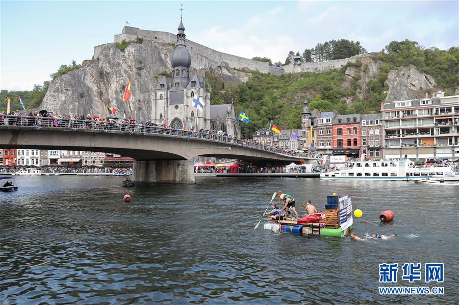 8月15日,在比利時南部小城迪南的默茲河上,人們參加“浴缸劃船節”的表演。新華社記者 張鋮 攝