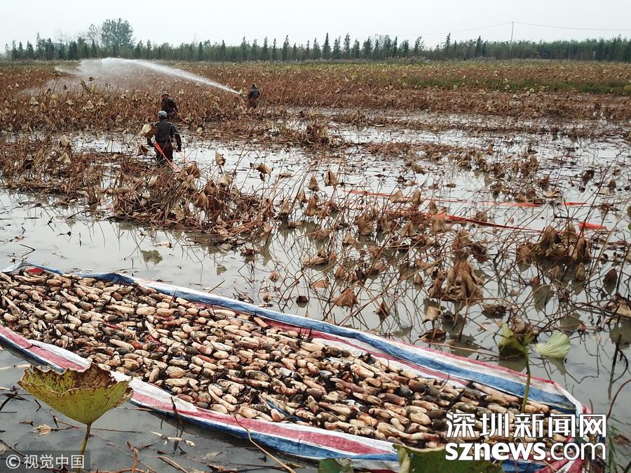 2018年10月14日,江蘇宿遷,泗洪縣曹廟鄉瓦廟村村民在藕蝦共作基地參加挖藕比賽。