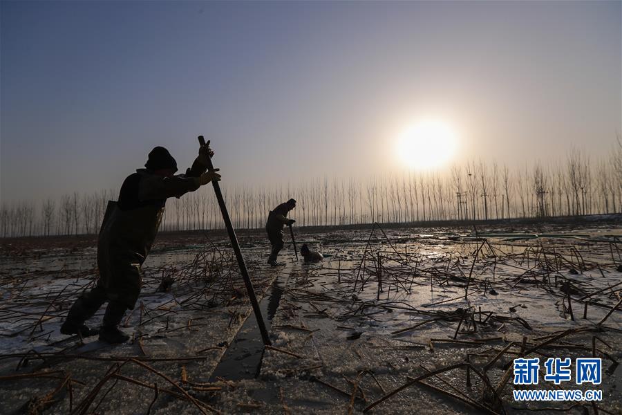 2月1日,在雄安新區安新縣東向陽村的一處藕塘,挖藕工將塘面結的冰用電鋸切成小塊后挪開。新華社記者沈伯韓攝
