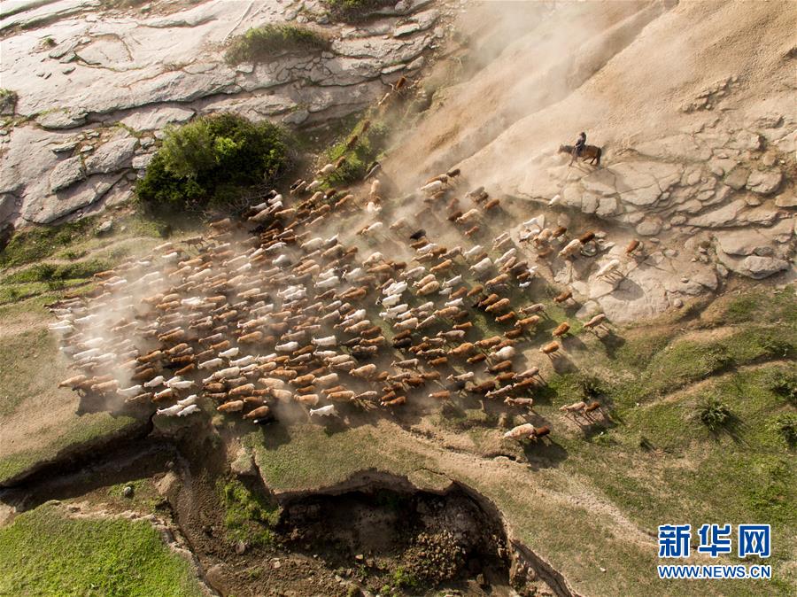 新疆阿勒泰地區(qū)福海縣牧民趕著牲畜向夏季牧場(chǎng)遷徙(6月6日無(wú)人機(jī)拍攝)。新華社記者丁磊攝