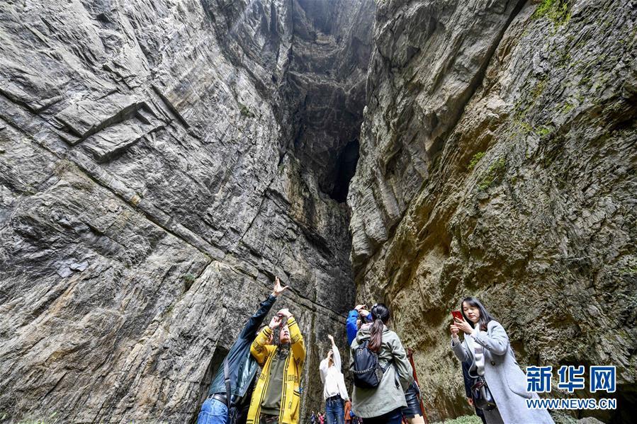 游客在天生三橋景區內的黑龍橋景點游覽(3月27日攝)。 新華社記者劉潺攝