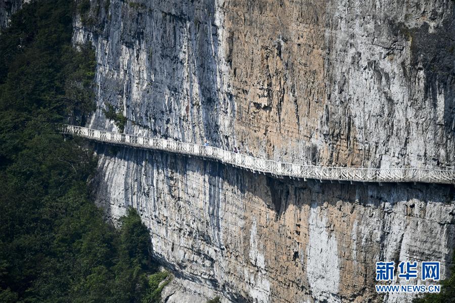 游客在重慶金佛山風景區內的絕壁棧道上游覽體驗(8月20日攝)。 新華社記者 劉潺 攝