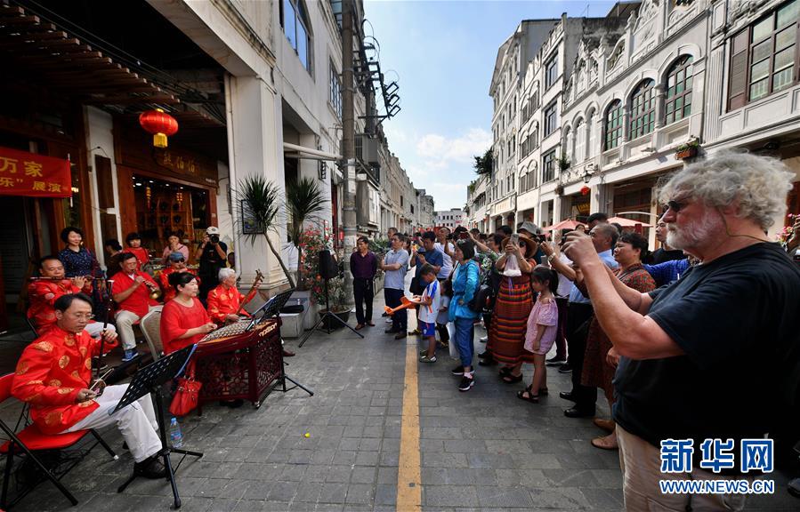游客在海口中山路騎樓老街觀看海南八音樂器表演(2019年2月6日攝)。新華社記者郭程攝